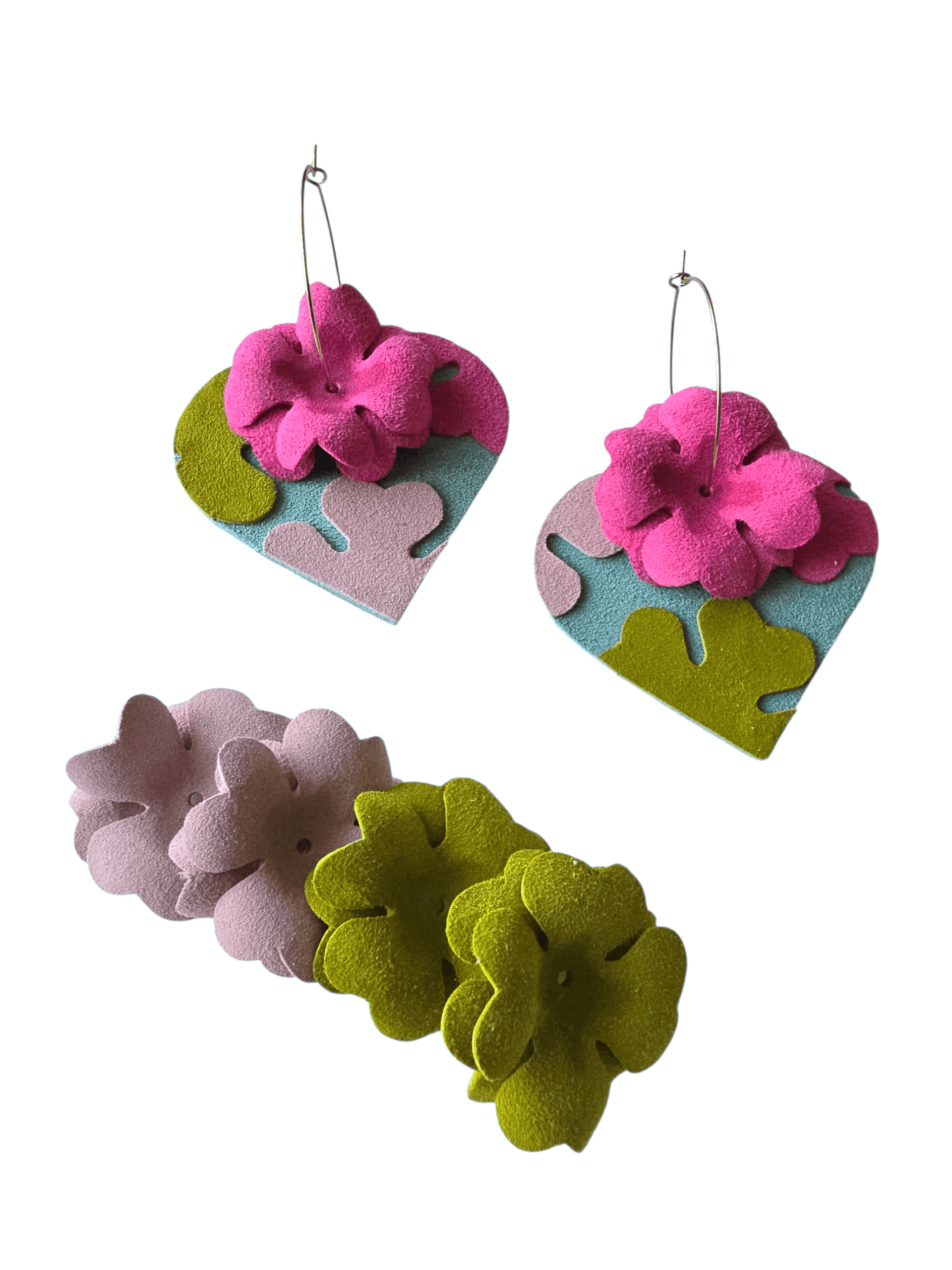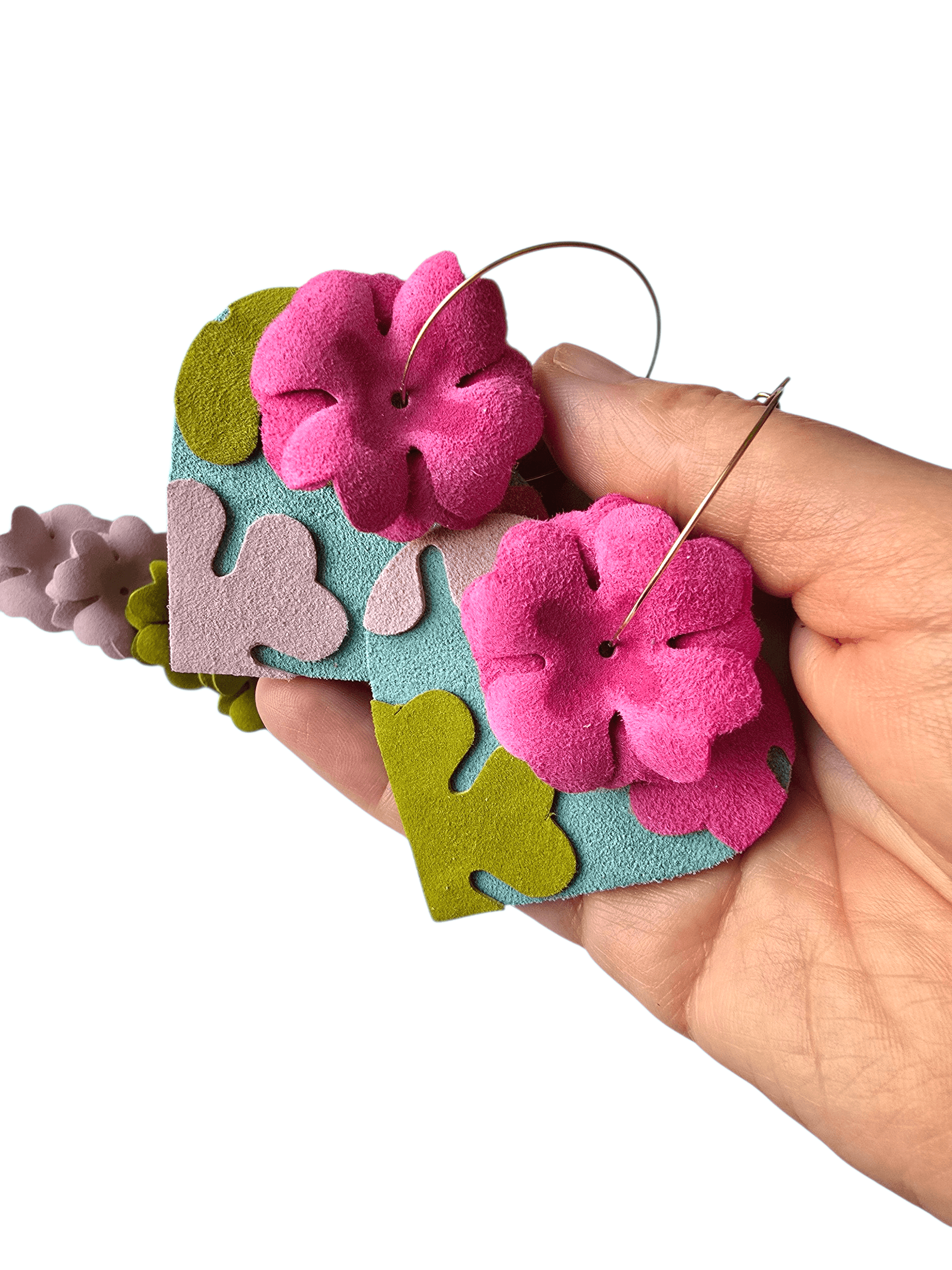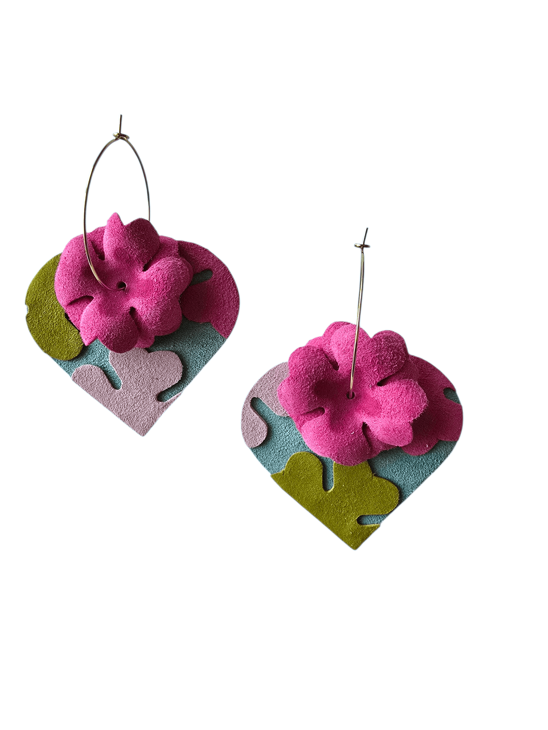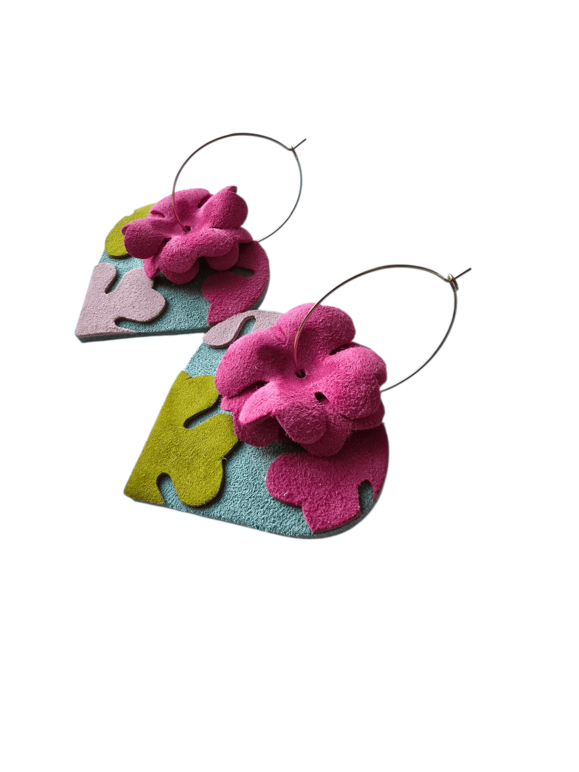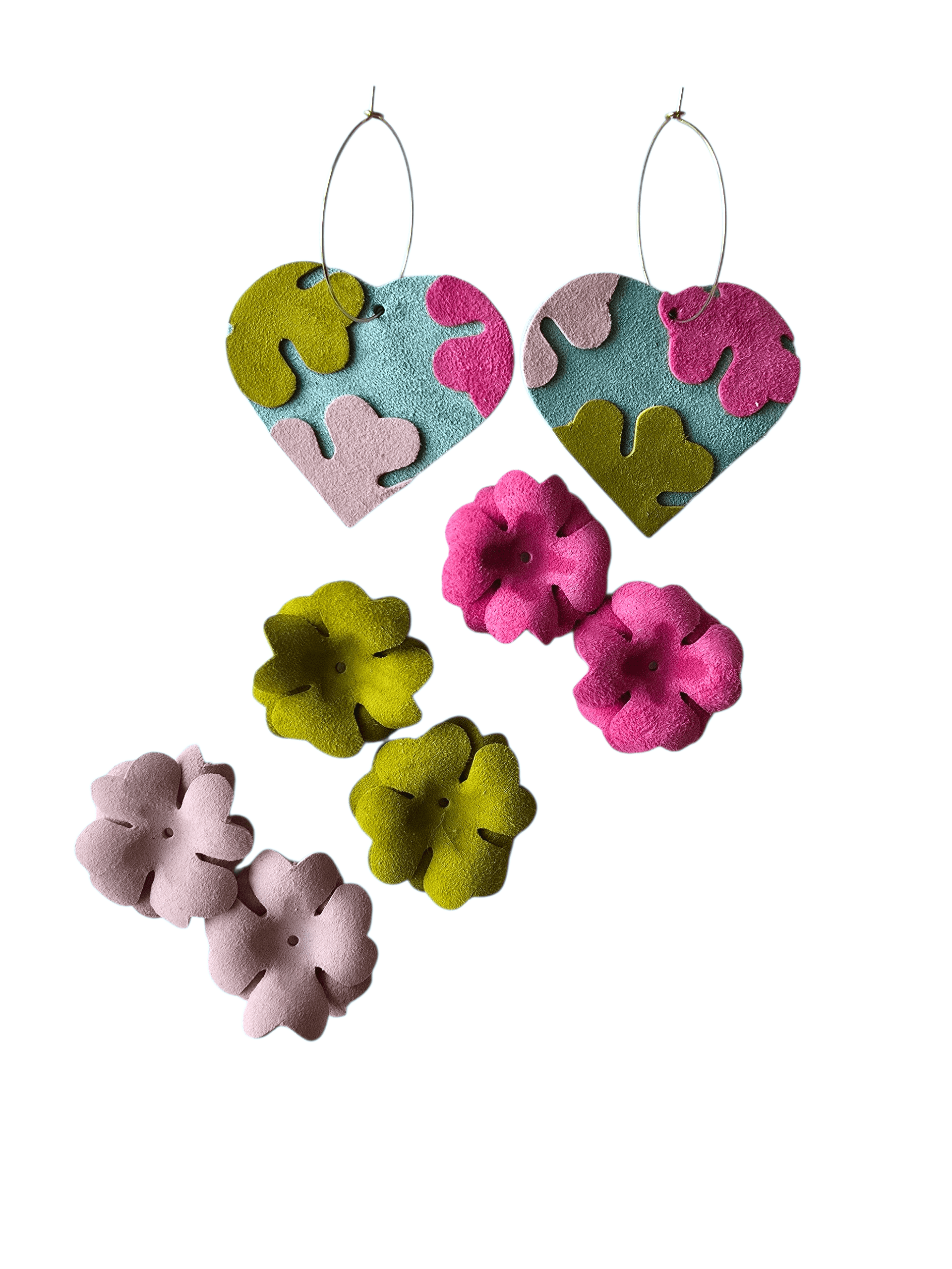 Cercei din piele naturală 4 in 1. Adică poți adăuga sau elimina elementele după cum îți este dispoziția. Pachetul conține doua inimioare și șase flori pe care le porți așa cum vrei. Baza este sistem hoops auriu din otel inoxidabil cu diametru de 3.5 cm.