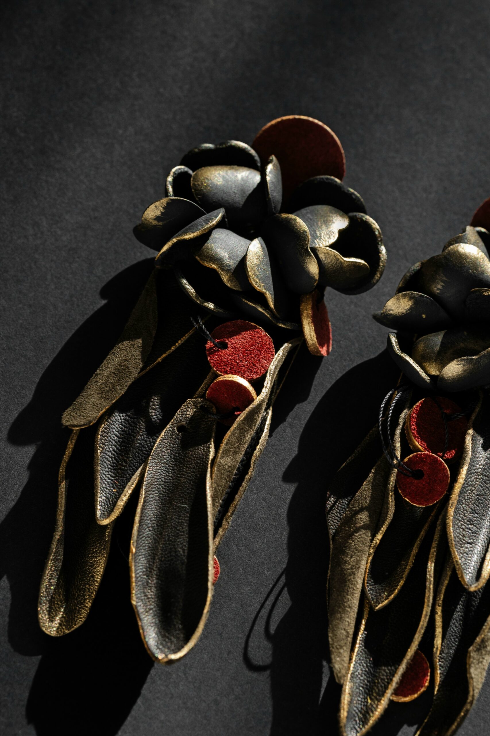Realizati din piele naturală modelata și pictată manual pe tortițe de otel inoxidabil auriu.