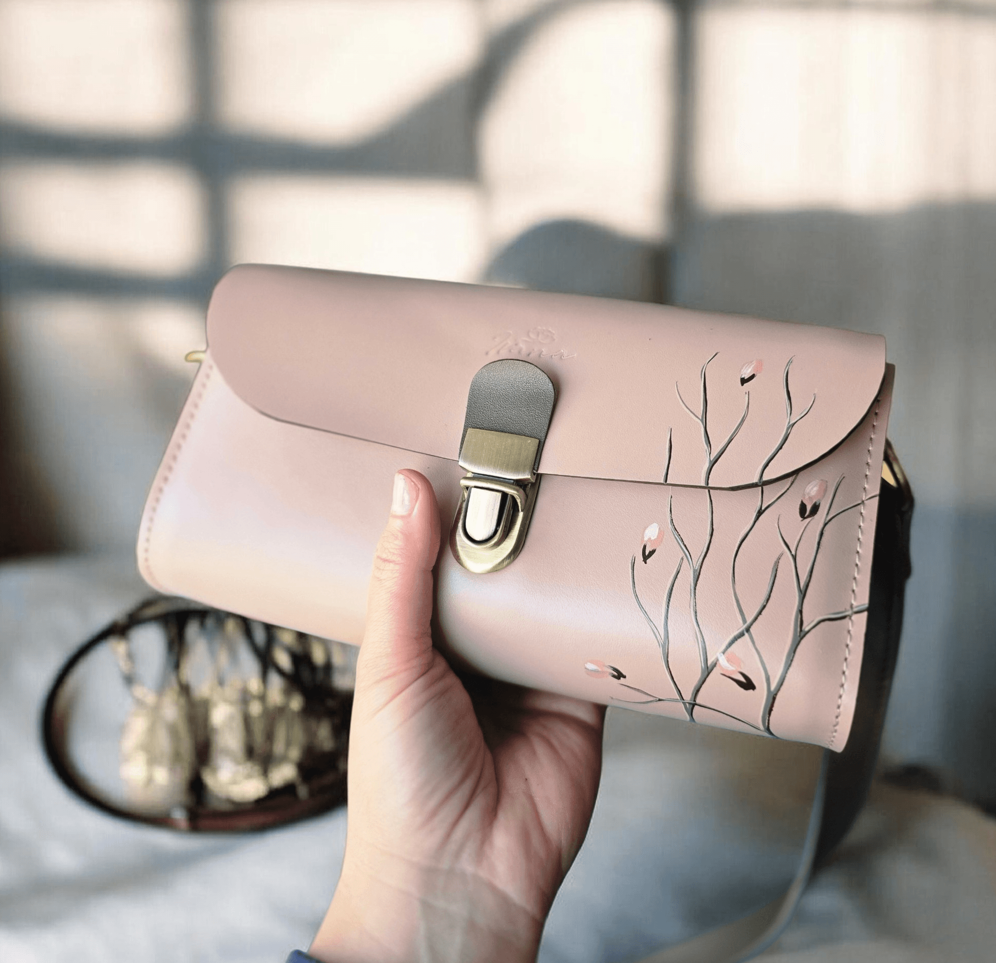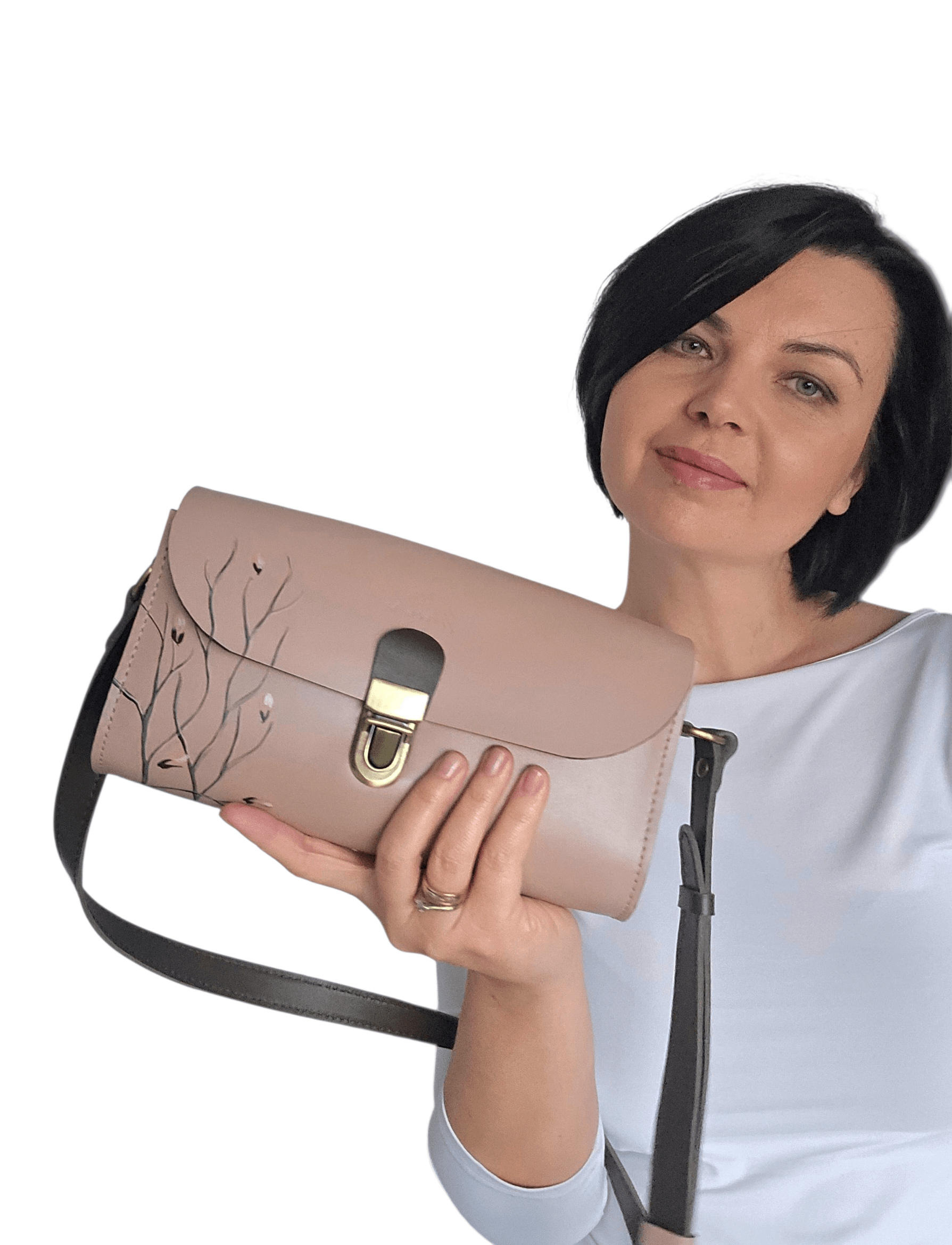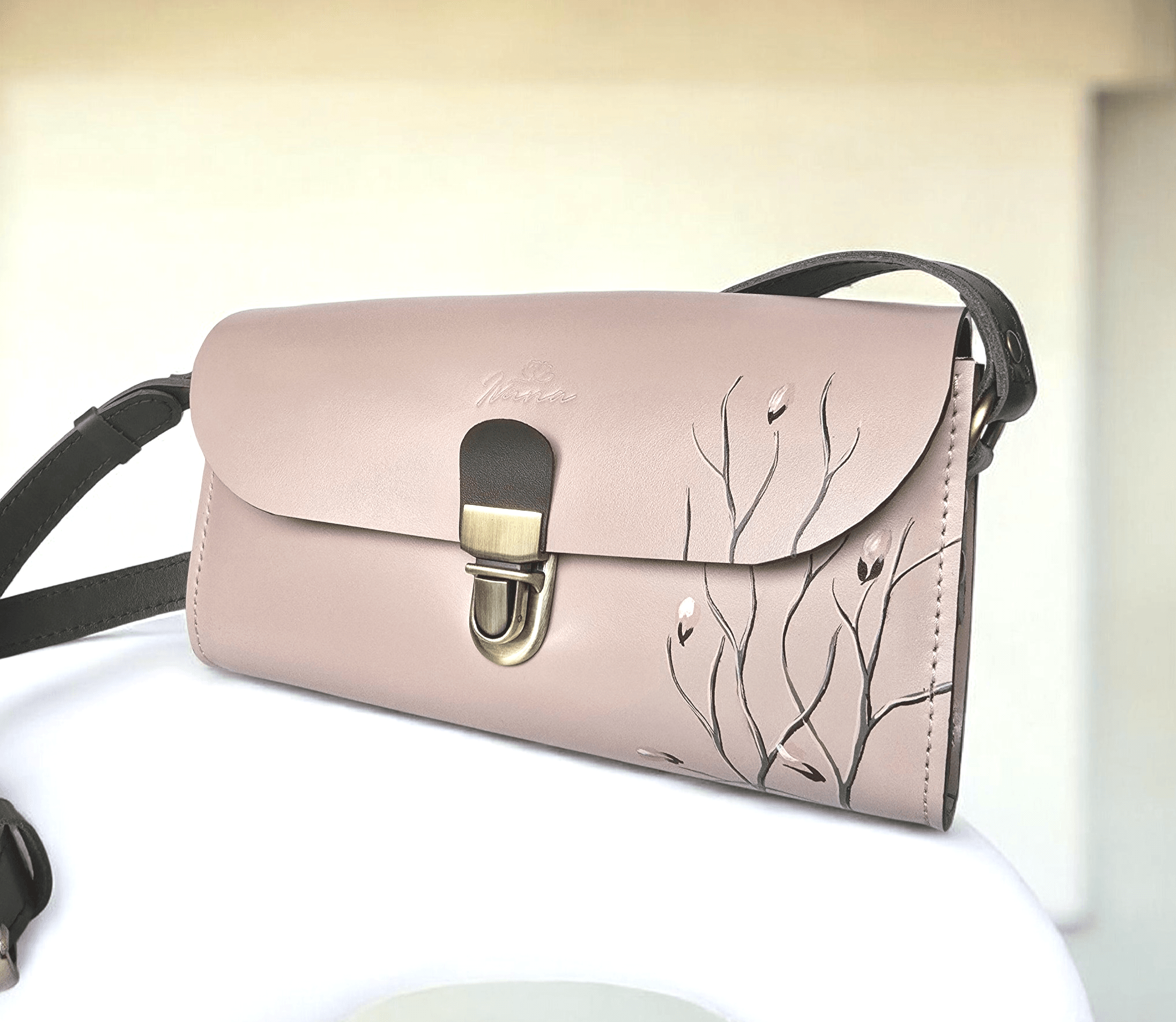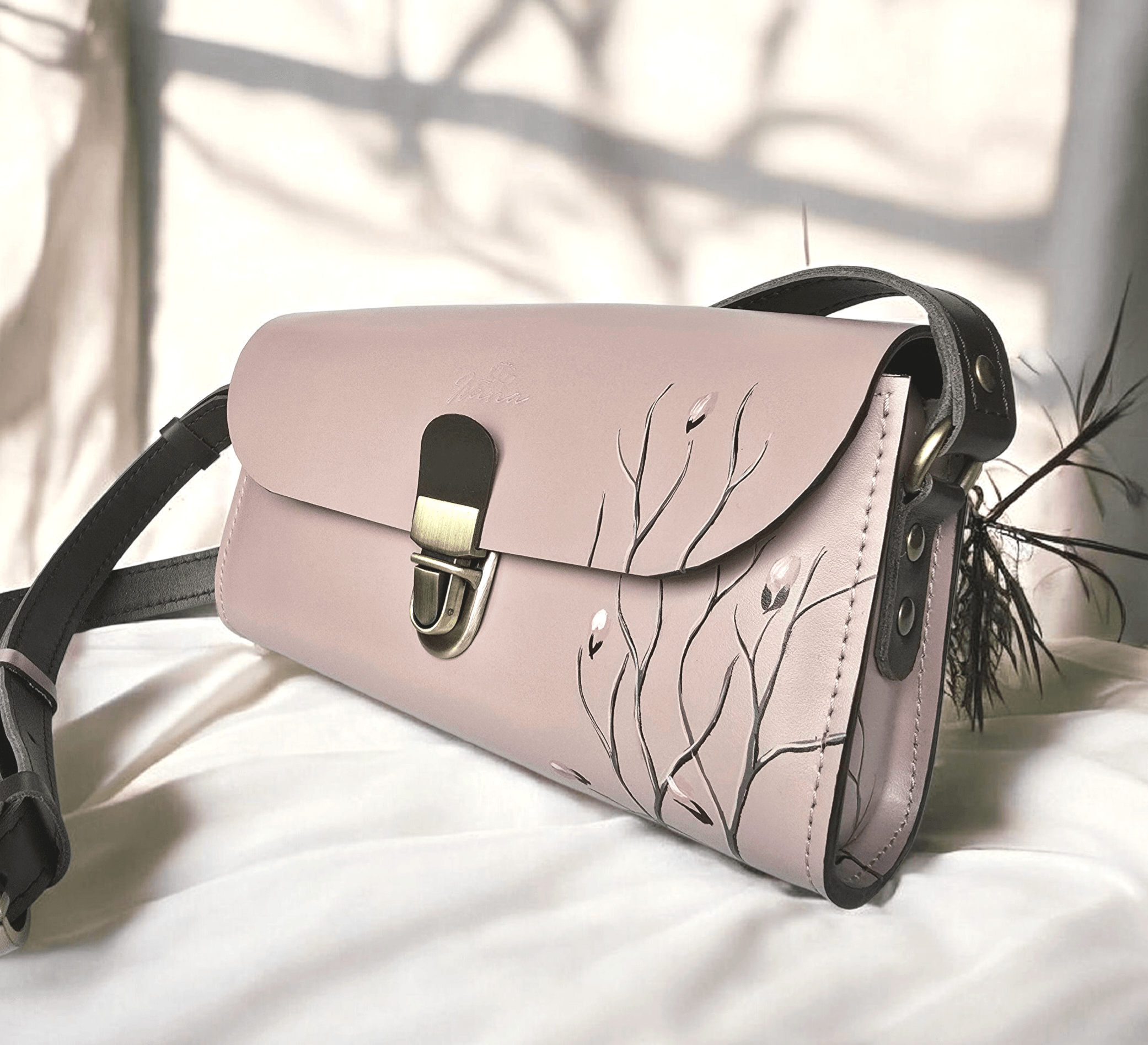 Geantă mică din piele naturală interior exterior. Are un singur compartiment prevăzut cu buzunar. Pictata manual. Bretea ajustabila.